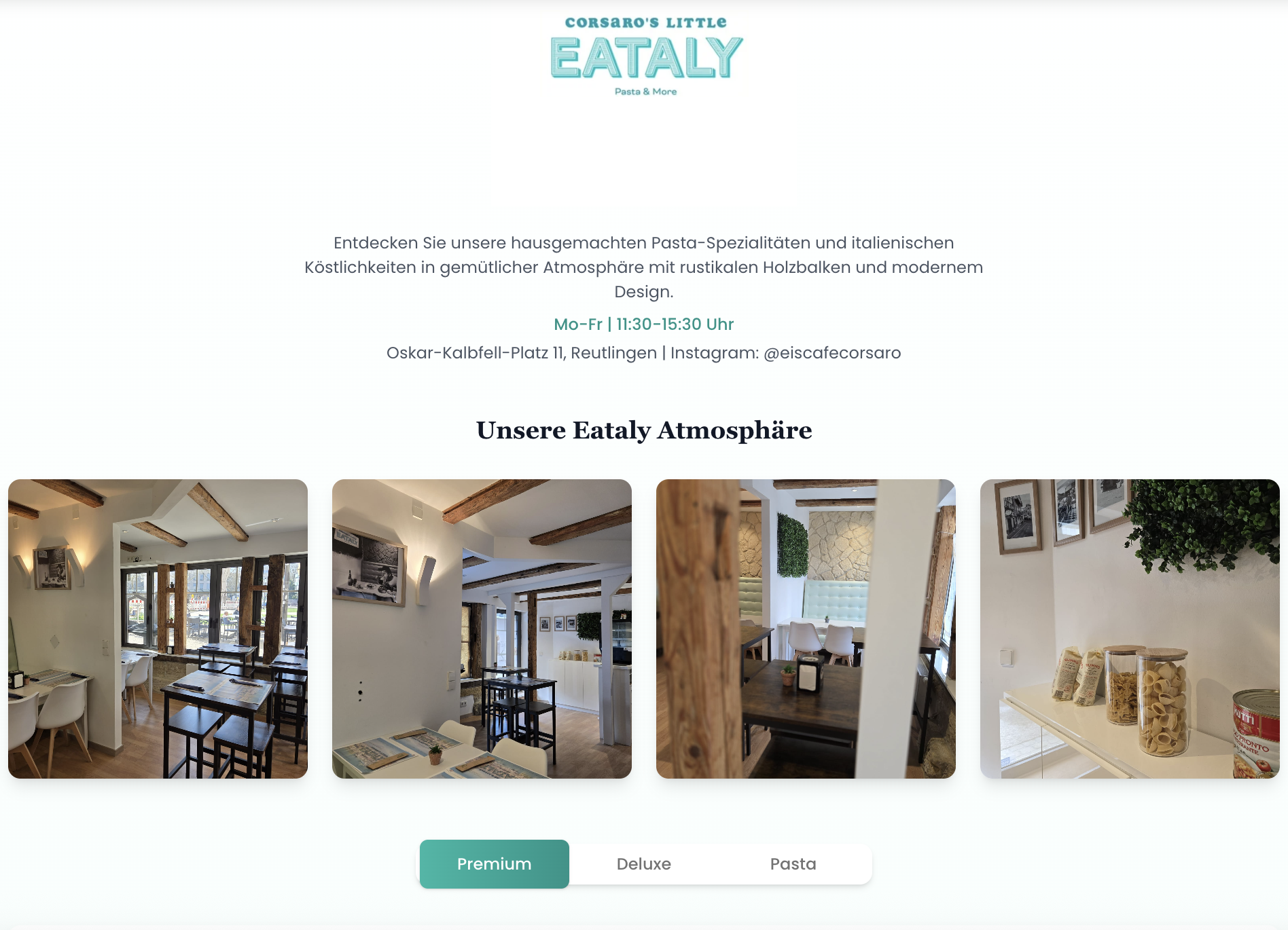 Eigener Bereich 'Corsaro's Little EATALY' mit Atmosphere-Gallery und Tab-Switch (Premium / Deluxe / Pasta). Lunch-Menu als Promo-Poster prominent platziert auf der Seite.